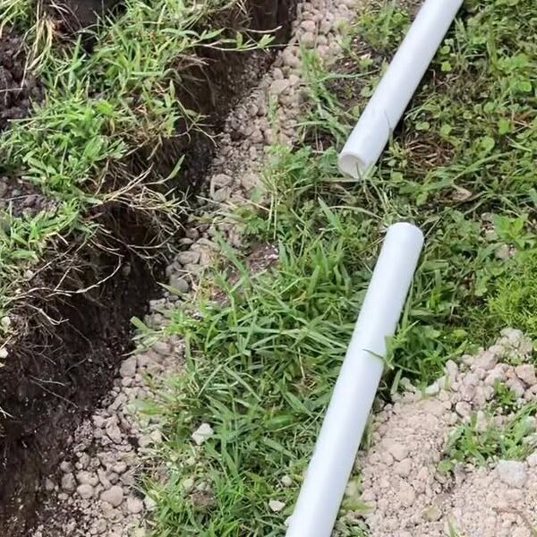 The drain is installed on a gentle downward slope (about 1 inch per 8 feet) to maintain steady water flow toward the outlet.