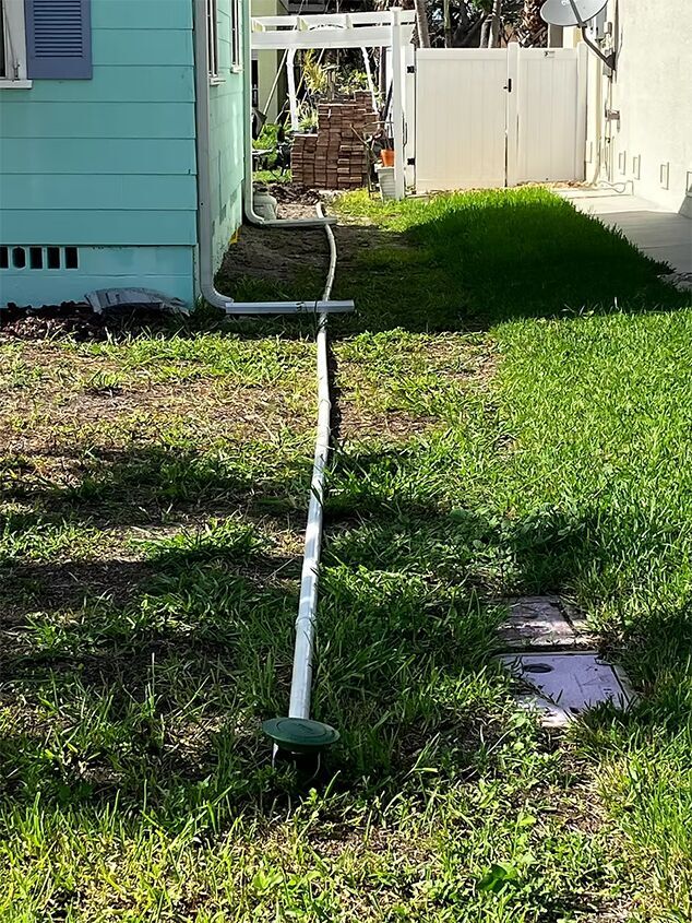 The endpoint where collected water exits — often a dry well, ditch, storm drain, or lower-grade section of the yard.
